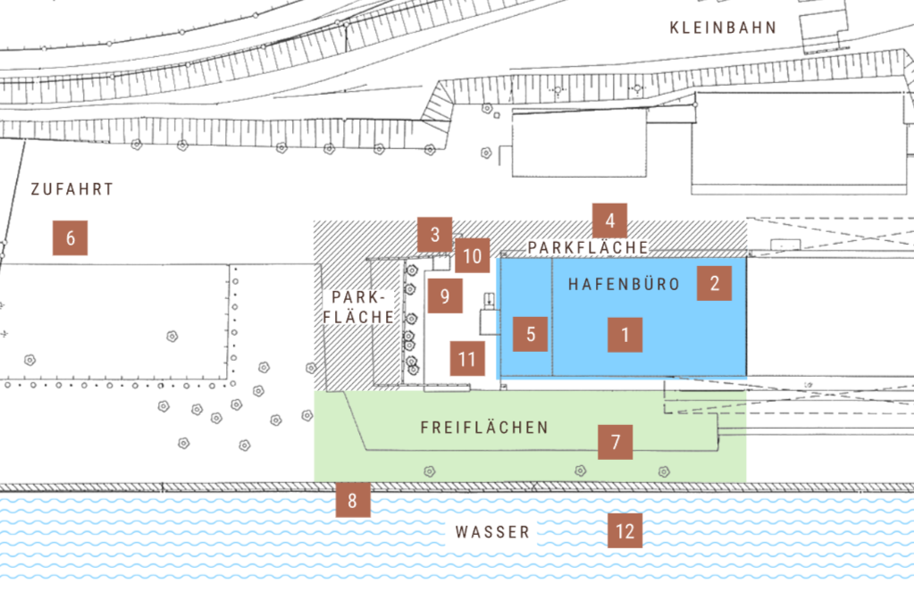 7 | Freifläche mit Strom- und Wasseranschluss für Pausen oder Arbeiten im Freien. Die Fläche kann für Feierlichkeiten reserviert werden. |